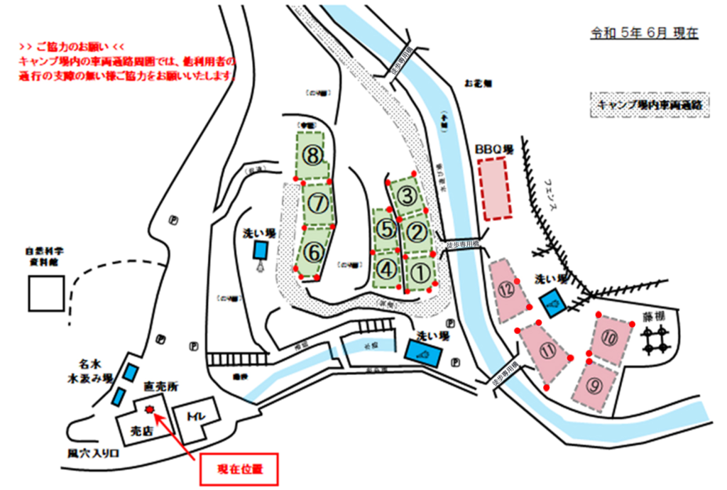 2台目以降は1台につき500円で所定の駐車スペースをご利用いただけます。又は、売店前への移動をお願いしています。 - イラスト図では「小川」表記とありますが、大きさはどのくらいですか?
